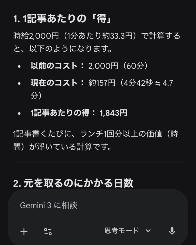 1回カフェに行くのを我慢してGeminiに投資するだけで、毎月数十時間の「自由」が手に入ります。