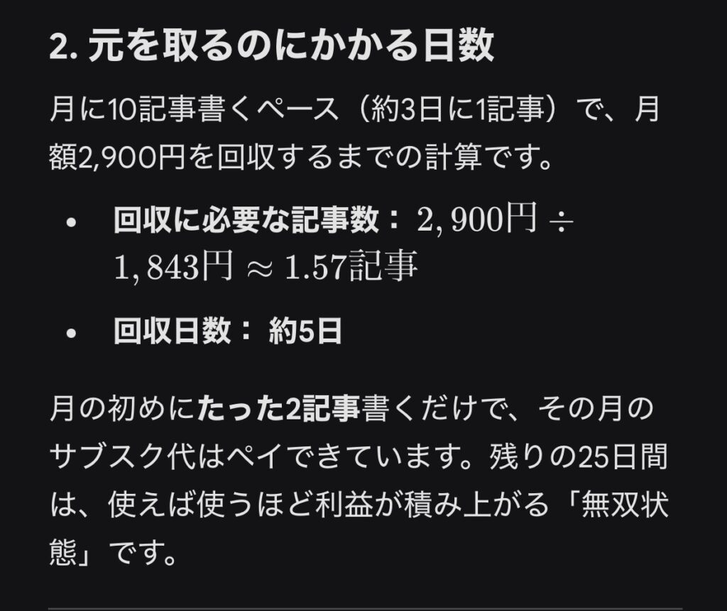 AIに自分のコスパを計算させてみました。結果、月額料金はたった約5日で回収できることが判明。これ、投資しない方が損だと思いませんか?